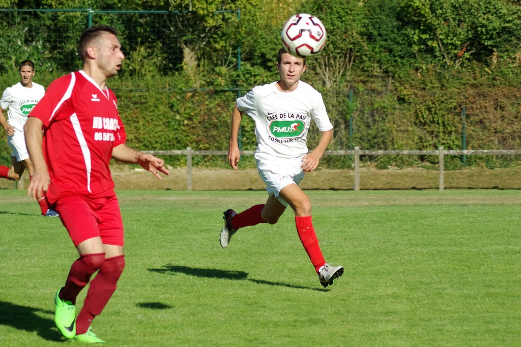 La qualité du jeu va baisser en seconde période avec des acteurs gênés par une forte chaleur, et des difficultés à poser le jeu au sol... De ces quarante-cinq minutes, on notera l'avantage pris par les locaux sur corner par Thépenier, bien oublié par la défense cosnoise : 3-2 (60è), mais une belle égalisation de la tête de Sylvain Guillaumot (photo) en toute fin de rencontre en conclusion d'un coup-franc bien frappé par Yann Touzeau pour Bastien Devin, au second poteau pour remise parfaite au buteur cosnois (3-3, 86è)...