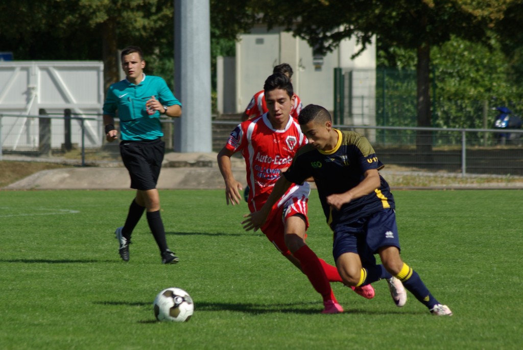Car tout se présentait sous les meilleurs auspices pour le groupe Gambardella cosnois de ce samedi… Amenés à rayer de la feuille de match leur portier U16 sur préconisation du club cosnois (*), l’équipe de Nevers n’avait d’autre alternative que de confier les gants à un joueur de champ ! Et cela pu sembler réussir aux cosnois puisque passé un coup-franc indirect bien malencontreux à quelques mètres des buts cosnois, la domination des locaux s’affirme au fil des minutes avec une ouverture du score consécutive à un corner de Quentin Babillon, repris victorieusement de la tête par Kolya Lecomte (1-0, 22è). Distançant ses gardes-du-corps, Valentin Belory double la mise en conclusion d’un raid solitaire : 2-0 (35è), avant que, dix minutes plus tard, Quentin Babillon, servi par Murat Cubukcu, ne porte ce qu’on était en droit d’attendre comme l’estocade : 3-0 (45è) !
