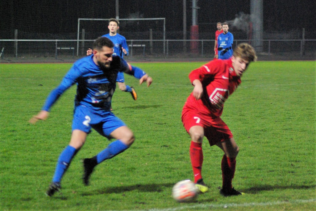 >>> photo >> le cosnois James Duarte, auteur du 1er but cosnois, aux prises avec le capitaine "snidois", Romain Devoucoux >>>