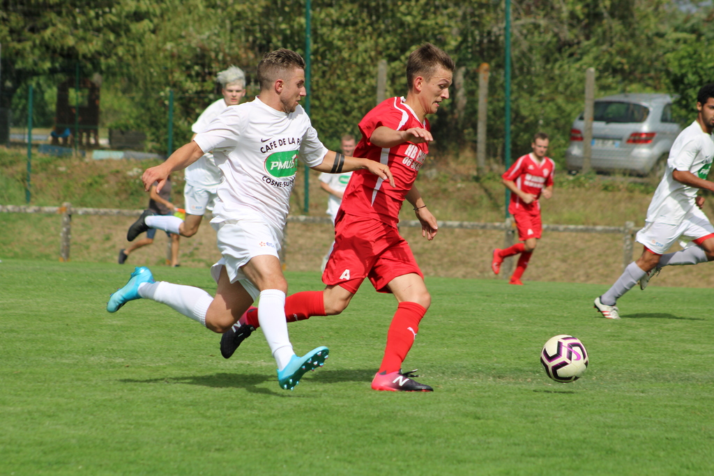 >>> photo >>> Tout juste rentré de congés, James Duarte (en blanc), en marquant 2 des 4 buts cosnois, n'a pas mis longtemps à trouver ses marques dans le groupe 2019/2020 >>>