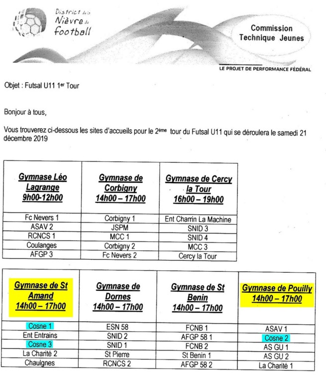 Après les U18 qui ont joué le 2ème tour du FUTSAL hivernal, samedi dernier à René Cassin, place aux U10/U11 qui en découdront également pour le 2ème tour... mais au gymnase de Saint Amand pour Cosne 1 et 3, et à Pouilly pour Cosne 2... : Samedi 21 de 14h à 17h...