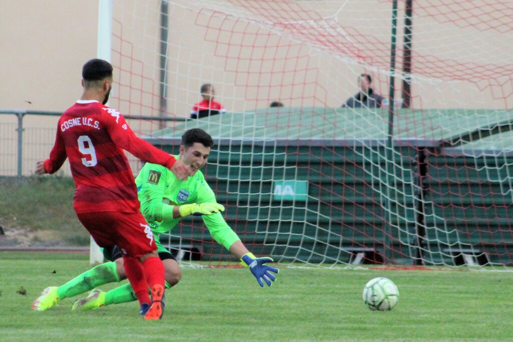 Nouvelle occasion pour le jeune cosnois qui, d’une tête plongeante n’arrive pas à cadrer la conclusion d’une superbe action collective à une touche de balle (20è).