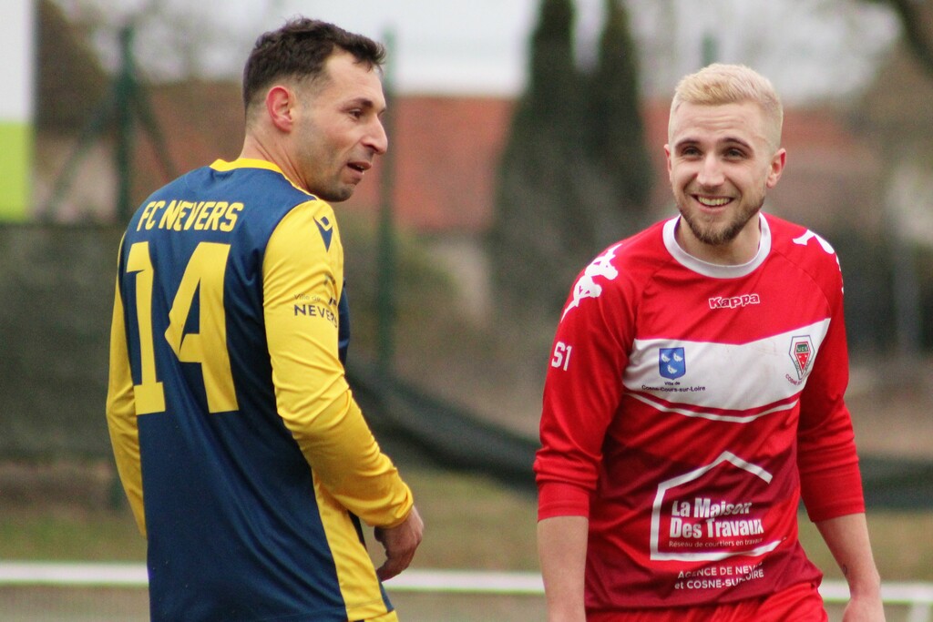 Varennes-Vauzelles : Nevers-Cosne : 1 - 1 (1 - 4 aux tirs au but). Arbitrage de M. Romain Garnier. Buts pour Nevers, Abib Fall (78è) ; pour Cosne, James Duarte (54è). Avertissements à Nevers FC 58, Cissé (27è), Fievet (53è), Keita (65è) ; à Cosne, Quentin Pelletier (48è). Exclusion temporaire à Cosne, Duarte James (90+3). Nevers FC 58 : Michard, Morel, Fievet, Baradi, Cissé, Keita, Fall, Bantanga (cap.), Audebert, Sol, Diaby. Entrés en jeu : Yachaoui, Toty, Kebdani. Cosne : Devilaine, Pelletier Alexis, Flock, Martin, Pelletier Quentin, Lecomte (cap.), Epinette, Ferchichi, Duarte, Ferras, Kalozafy. Entrés en jeu : Forestier Enzo, Chatelin, Diagne. |