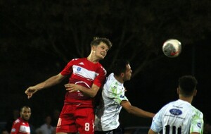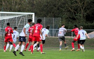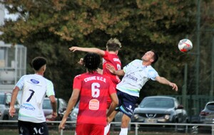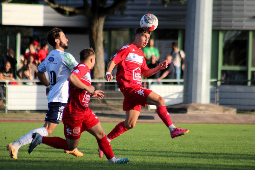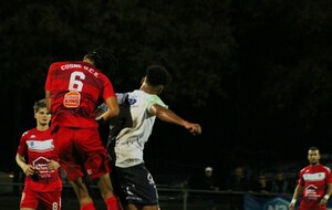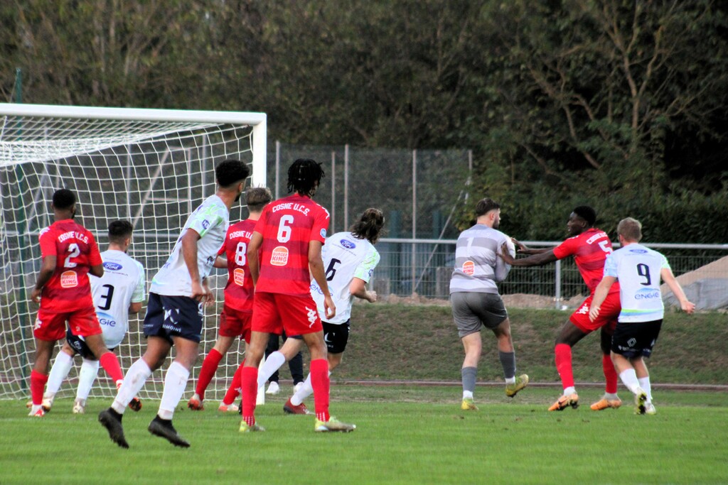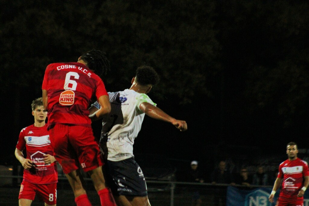 >>> photo >>> La défense cosnoise (Nathan Deheppe, à la tête, devant steven Jeaunet) a tenu bon pour garder son but d'avance >>>