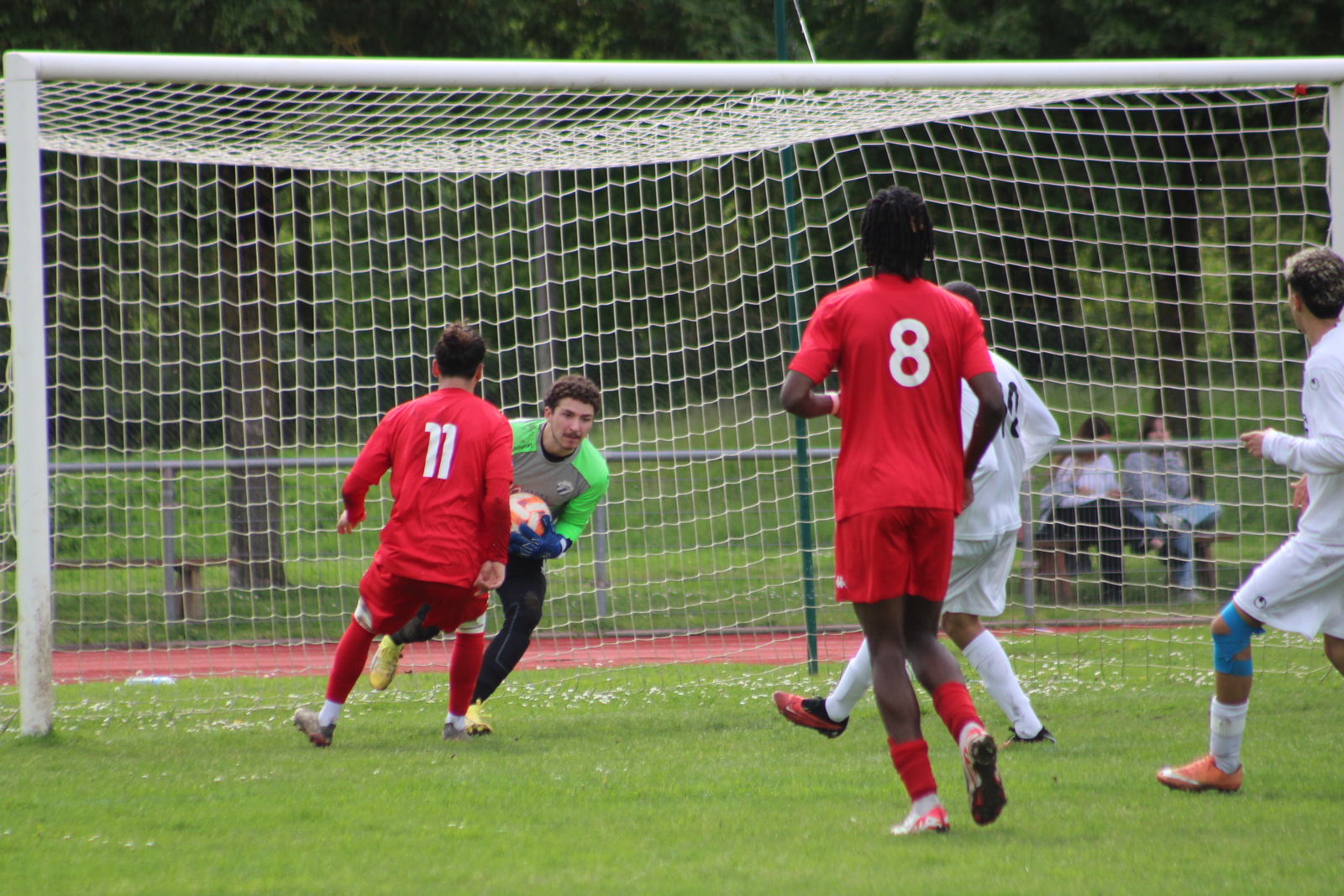 >>> En Régional 3, les cosnois (de dos, Mattéo Berthé en 11 et Adien Chance en 8) on été très peu dangereux face à Sens B >>>