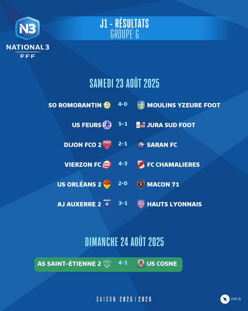 LA FICHE DU MATCH : L'Étrat (stade Aimé Jacquet) : arbitrage de M.Benkada (Haute-Loire). Buts pour St Étienne B : Jibril OTHMAN (3è), Maedine MAKHLOUFI (50è, 62è et 77è) ; pour Cosne, Mohamed MOUEFFEK (8è sur penalty). Avertissements à St Étienne : Mouton (45è), Cheikh (53è), Hornech (80è) ; à Cosne, Jeaunet (15è), Berthé (83è). St Étienne B : Noa DELACROIX, Strahinja STOJKOVIC (Ewan HORNECH, 62è), Mahedine MAKHLOUFI (cap), Axel DODOTE, Kevin PEDRO, Luan GADEGBEKU (Yanis MIMOUN, 62è), Valentin DEPALLE, Jules MOUTON, Jibril OTHMAN (Noah MOULIN, 78è), Nadir EL JAMALI (Medhy LUTIN-ZIDÉE, 67è), Issam CHEIKH. Cosne : DIAZAYAKANA Nsimba, ALIMAT-VIGNAT Alban, JEAUNET Steven, BENABED Faouzi, TOURÉ Abdel (cap), VANNIER Nicolas, DUARTE James (ONGADIA Junior, 67è), LECOMTE Kolya, ADOUL Luc (BERTHÉ Mattéo, 67è), KALOZAFY Mathis (DIAWARA Elhadji, 77è), MOUEFFEK Mohamed (SOUCHET Léo, 90è). |