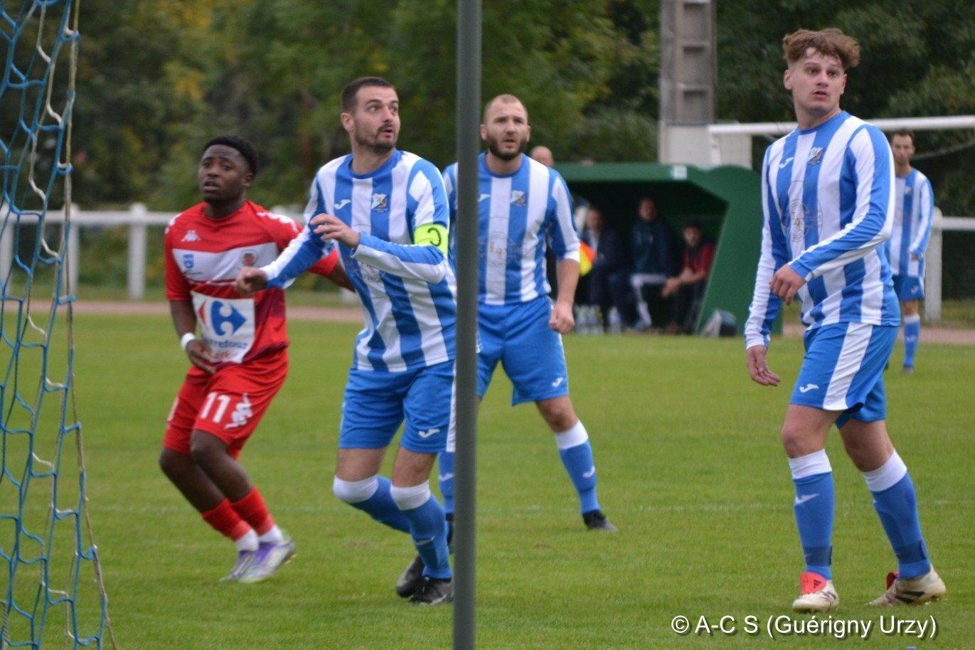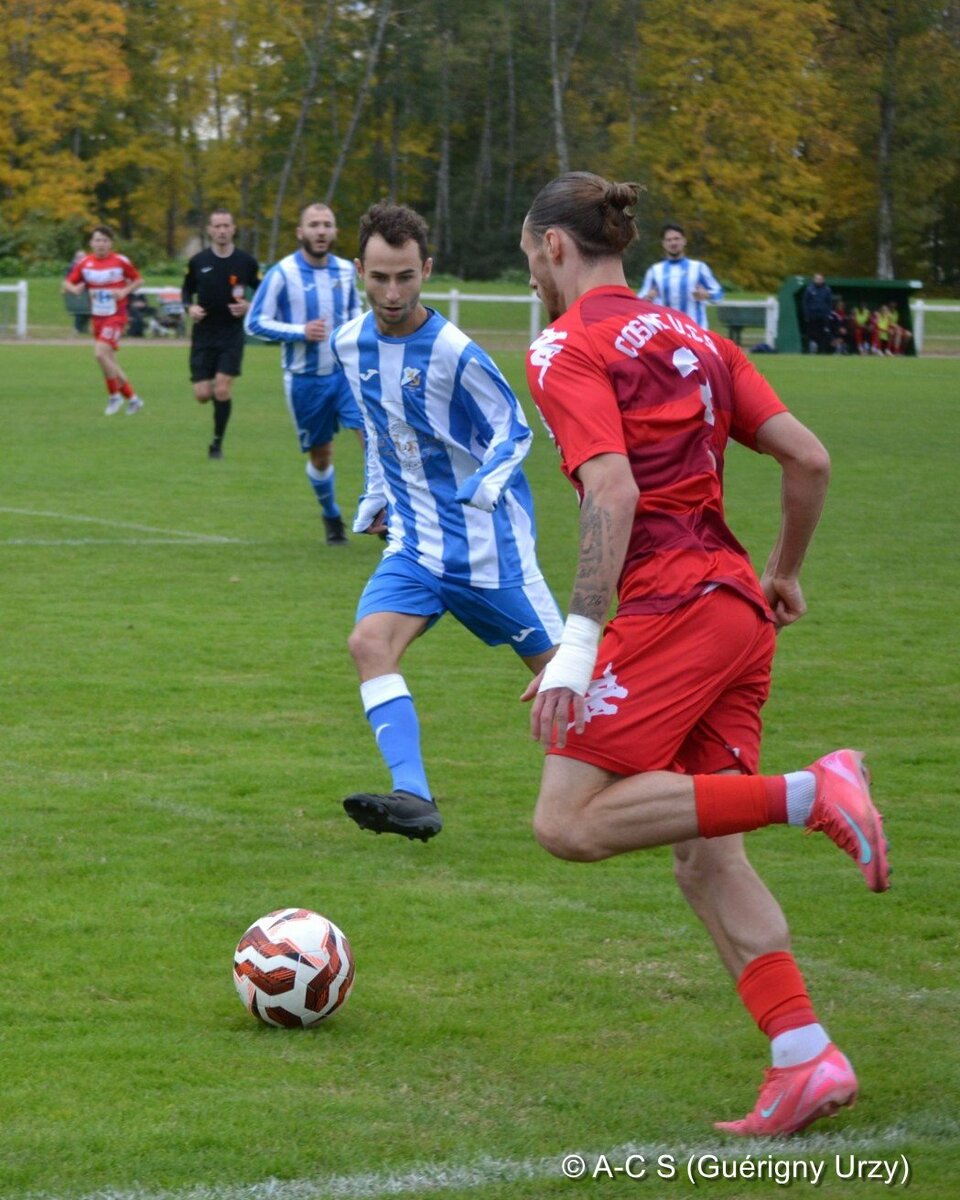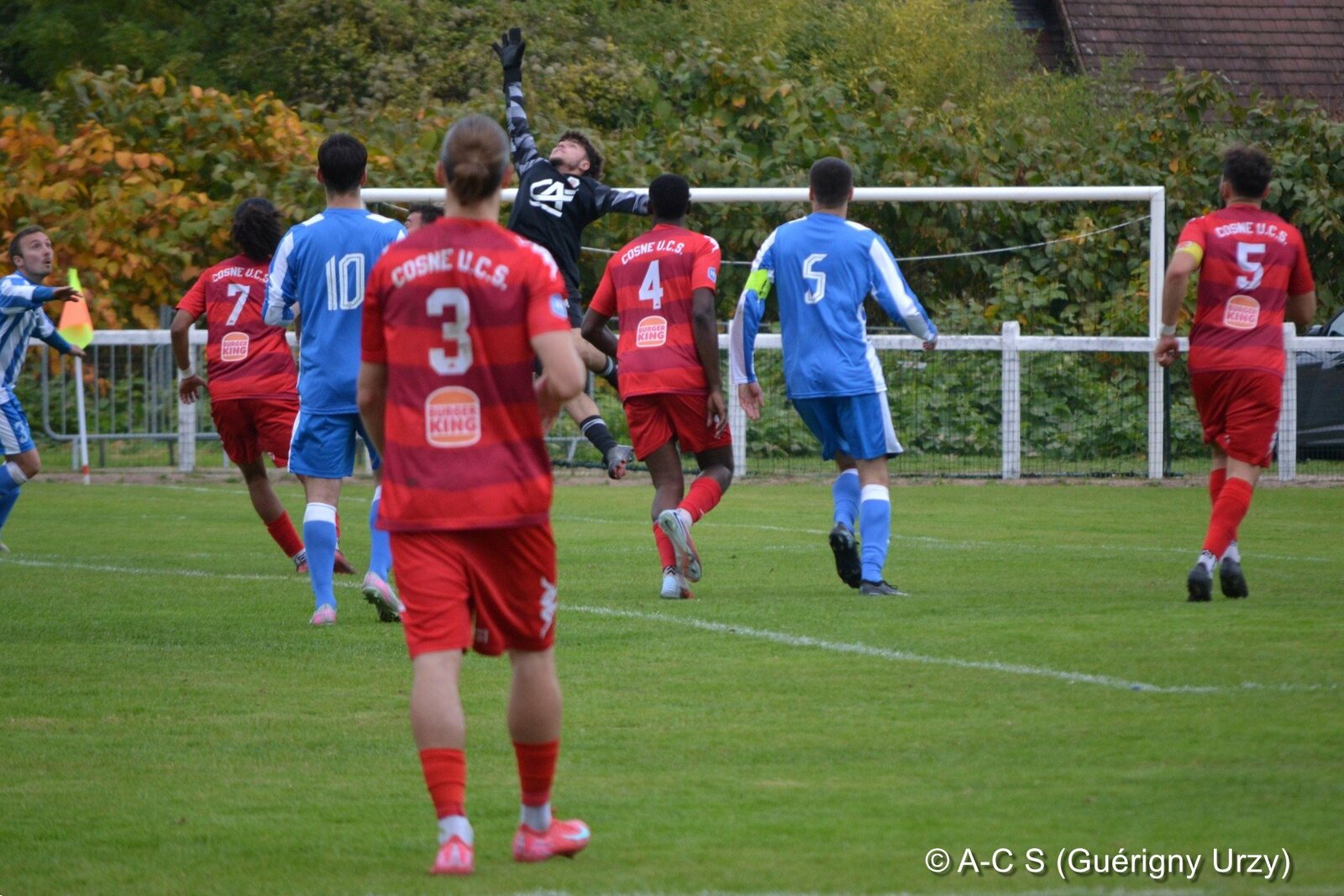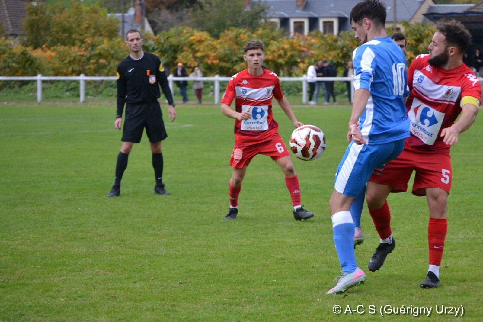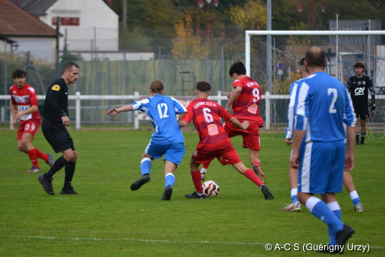 GUÉRIGNY (stade municipal) : Guérigny – Cosne B, 3-2 (2-2). Arbitre : M. Binacchi. Buts pour Guérigny, Roger (10è), Larivé (36è) et Brunerie (75è) ; pour Cosne B, Hurtault Noa (14è) et Lecoutère (42è). Avertissements ; à Guérigny, Kebdani (90è) ; à Cosne B, Gunet (55è) et Kamassu (71è). Exclusion temporaire à Guérigny, Larivé (41è). Guérigny : Saint Jost, Meunier, Lemetayer, Laroche Aurélien, Larivé (Cap), Simoes, Krack, Gaillard, Dutilleux, Laroche Romain, Roger. Entrés en jeu : Jeault, Brunerie, Kebdani. Cosne B : Duval, Czajkowski Liam, Gunet, Kamassu, Lecoutère (cap), Desmergée, Hirt, Lebel, Hurtault Noa, Lebas, Mashaka. Entrés en jeu : Ongadia, Adoul Pier, Martini. |