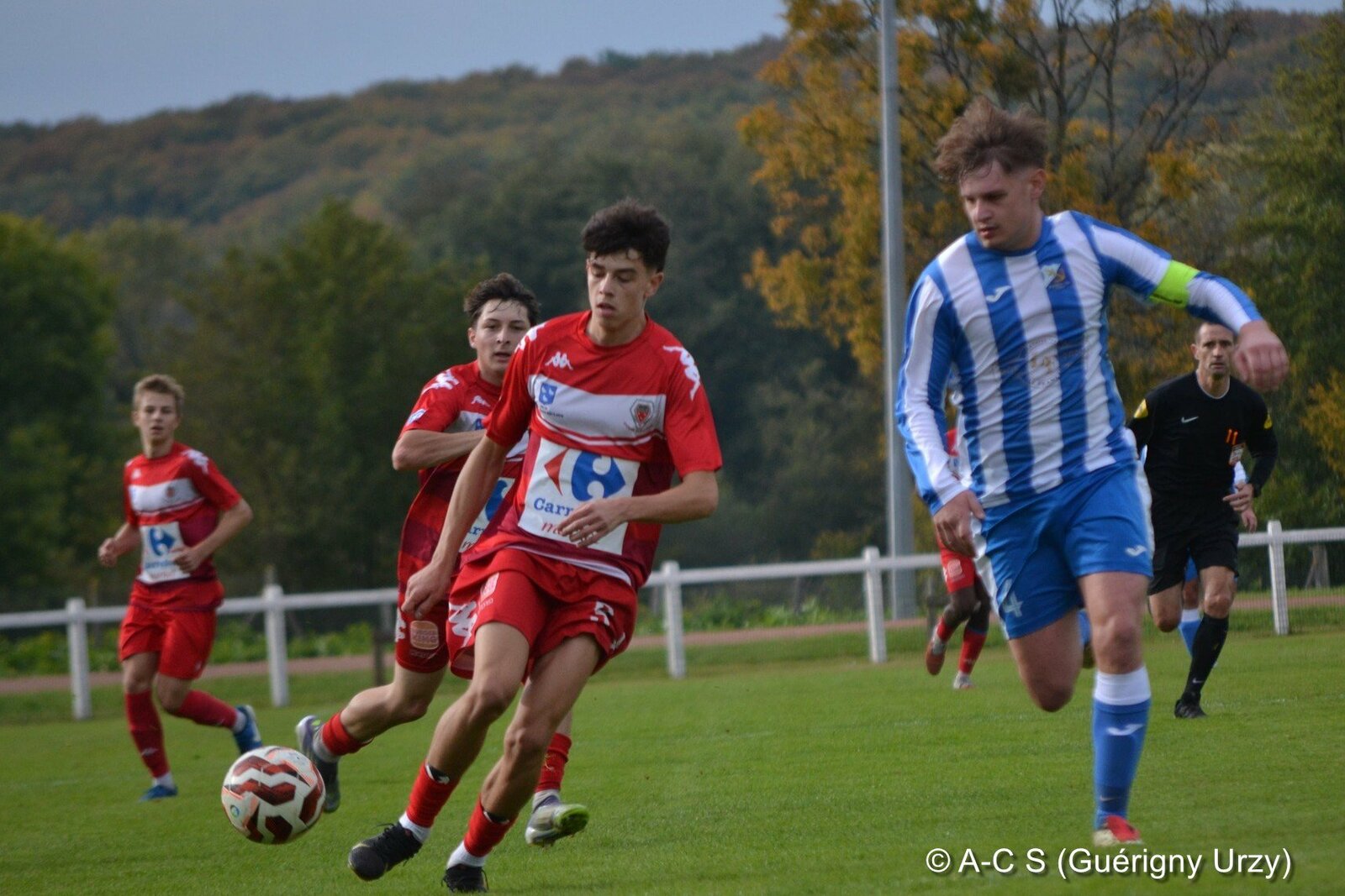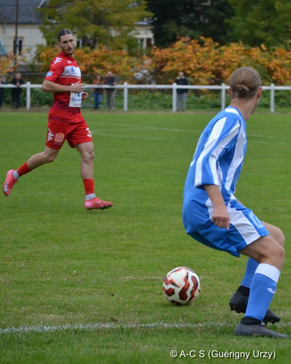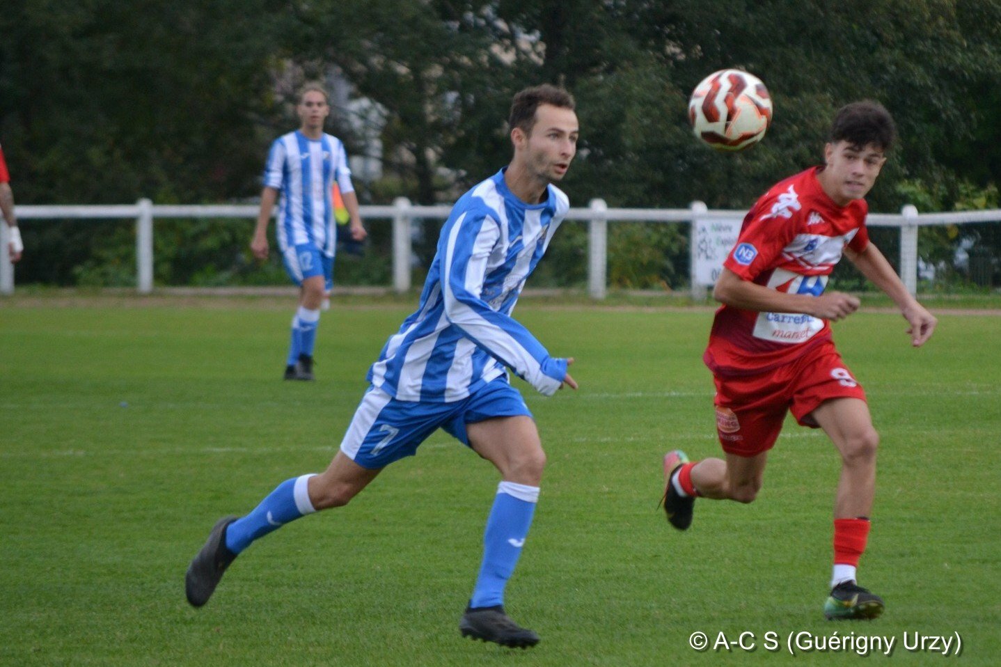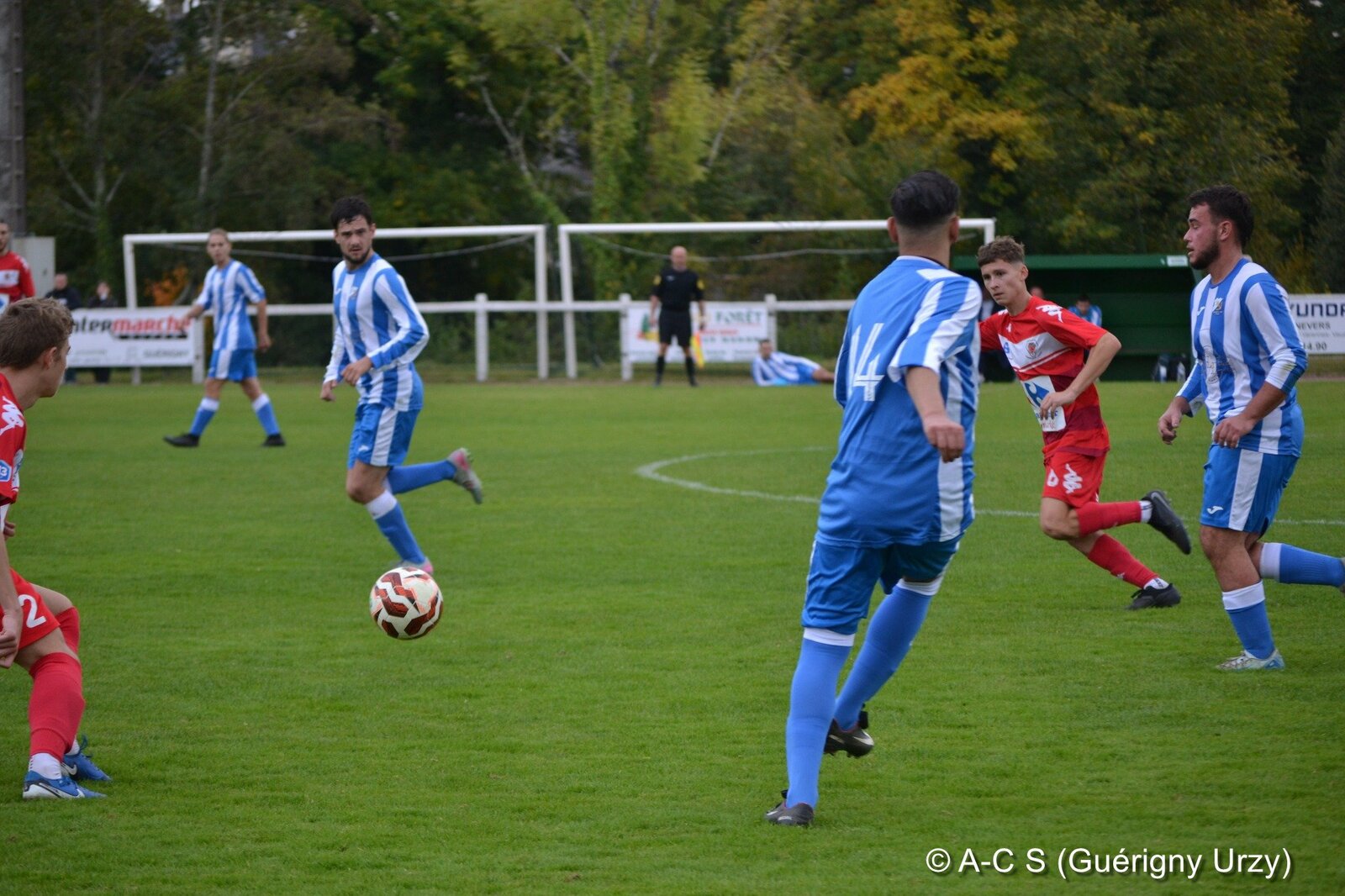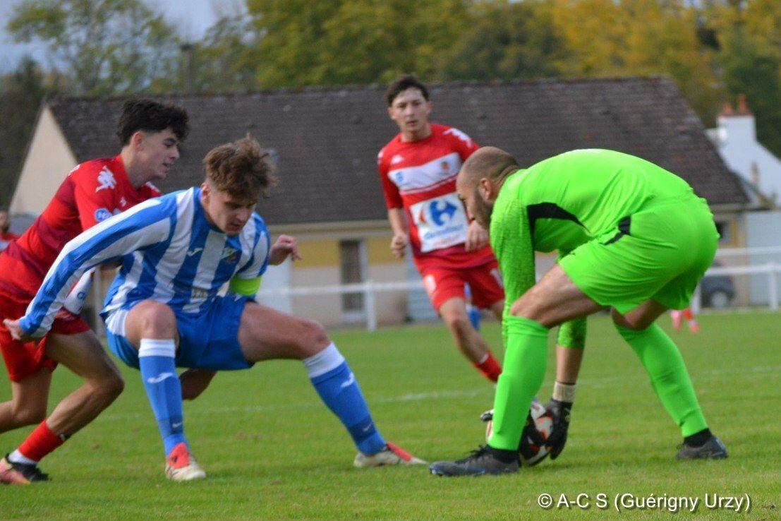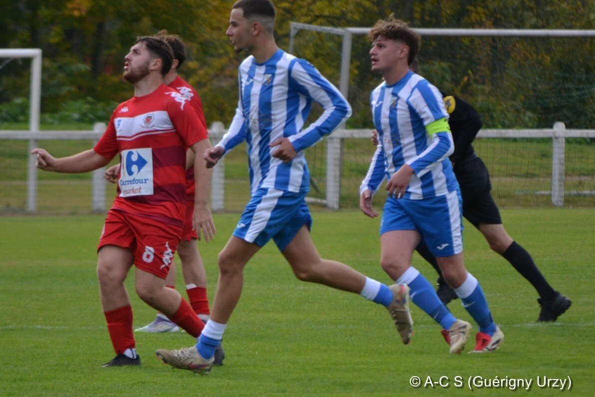 GUÉRIGNY (stade municipal) : Guérigny – Cosne B, 3-2 (2-2). Arbitre : M. Binacchi. Buts pour Guérigny, Roger (10è), Larivé (36è) et Brunerie (75è) ; pour Cosne B, Hurtault Noa (14è) et Lecoutère (42è). Avertissements ; à Guérigny, Kebdani (90è) ; à Cosne B, Gunet (55è) et Kamassu (71è). Exclusion temporaire à Guérigny, Larivé (41è). Guérigny : Saint Jost, Meunier, Lemetayer, Laroche Aurélien, Larivé (Cap), Simoes, Krack, Gaillard, Dutilleux, Laroche Romain, Roger. Entrés en jeu : Jeault, Brunerie, Kebdani. Cosne B : Duval, Czajkowski Liam, Gunet, Kamassu, Lecoutère (cap), Desmergée, Hirt, Lebel, Hurtault Noa, Lebas, Mashaka. Entrés en jeu : Ongadia, Adoul Pier, Martini. |