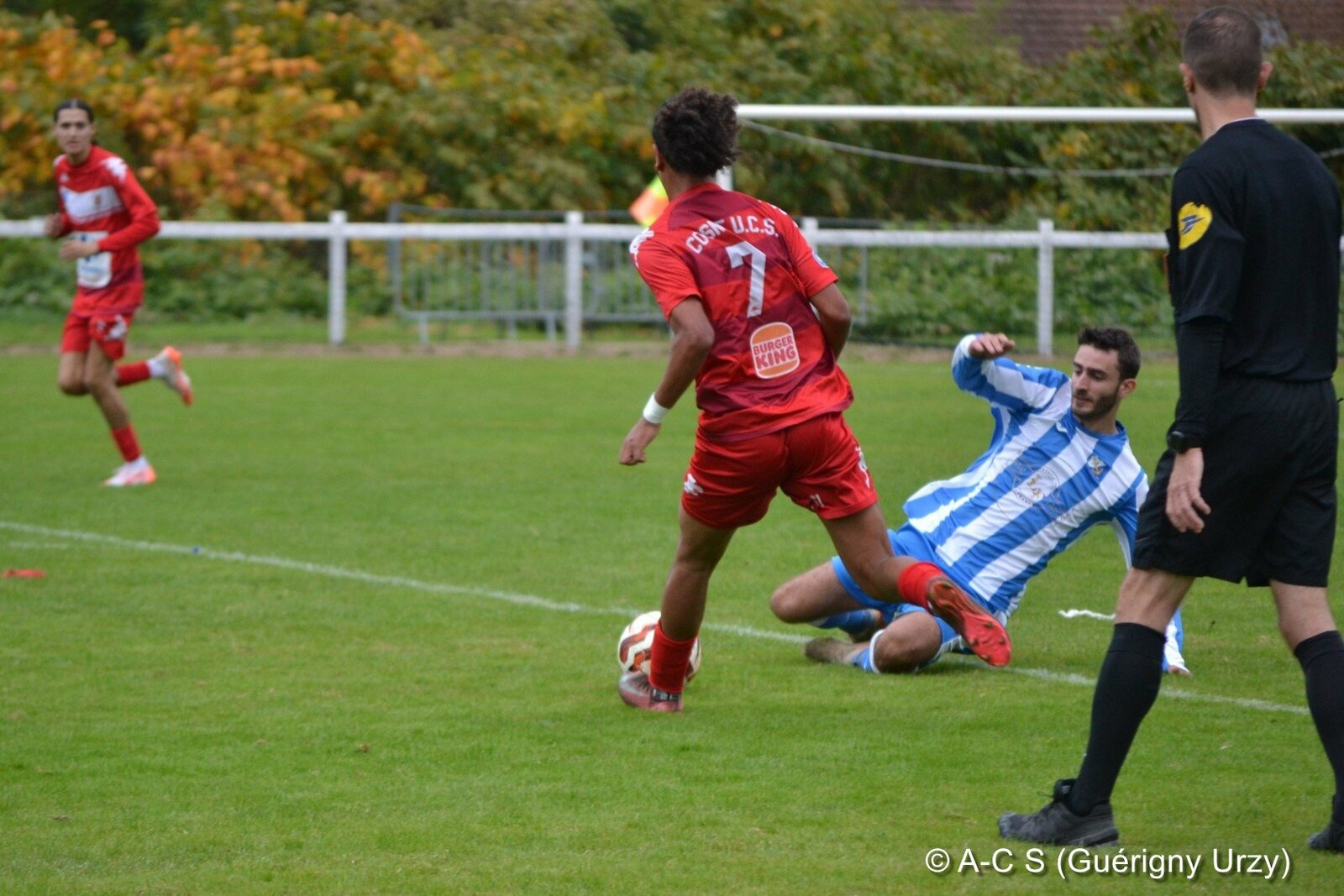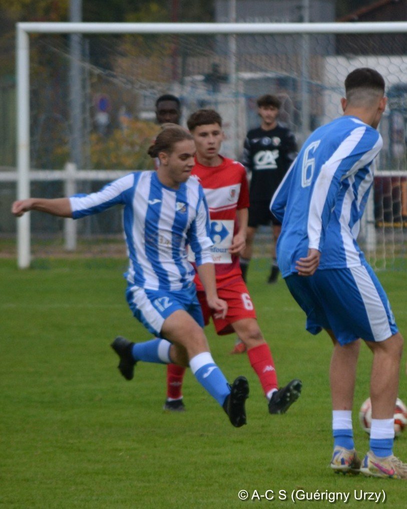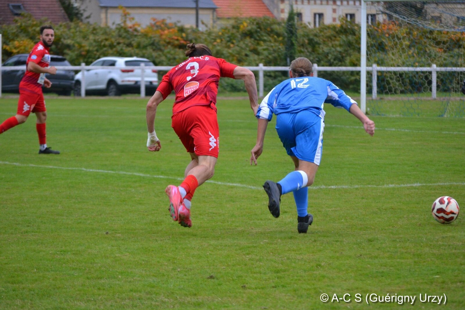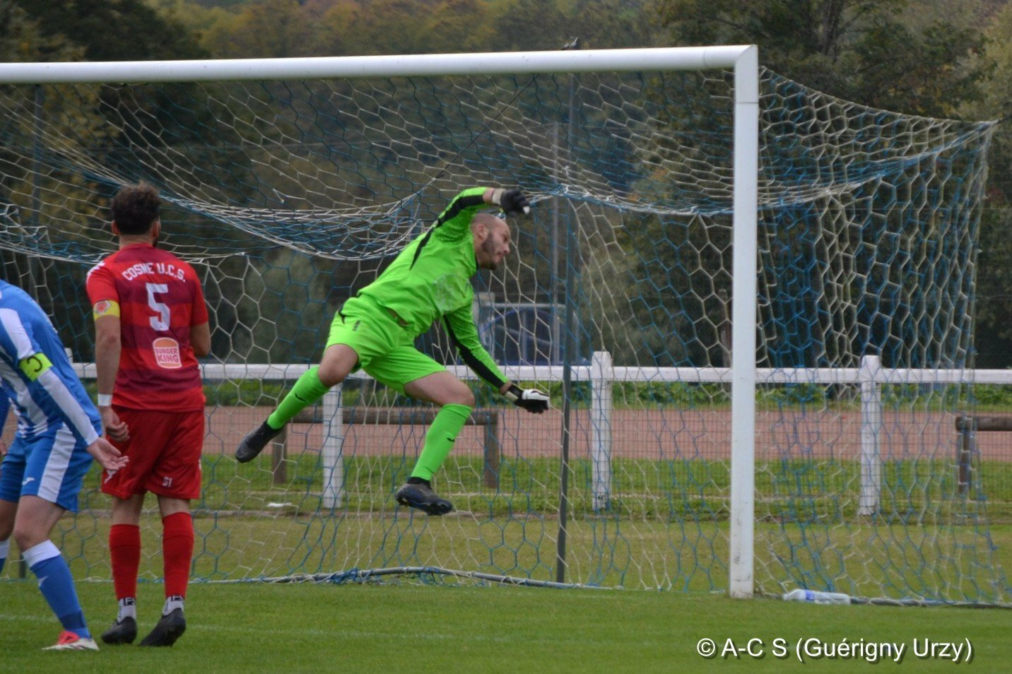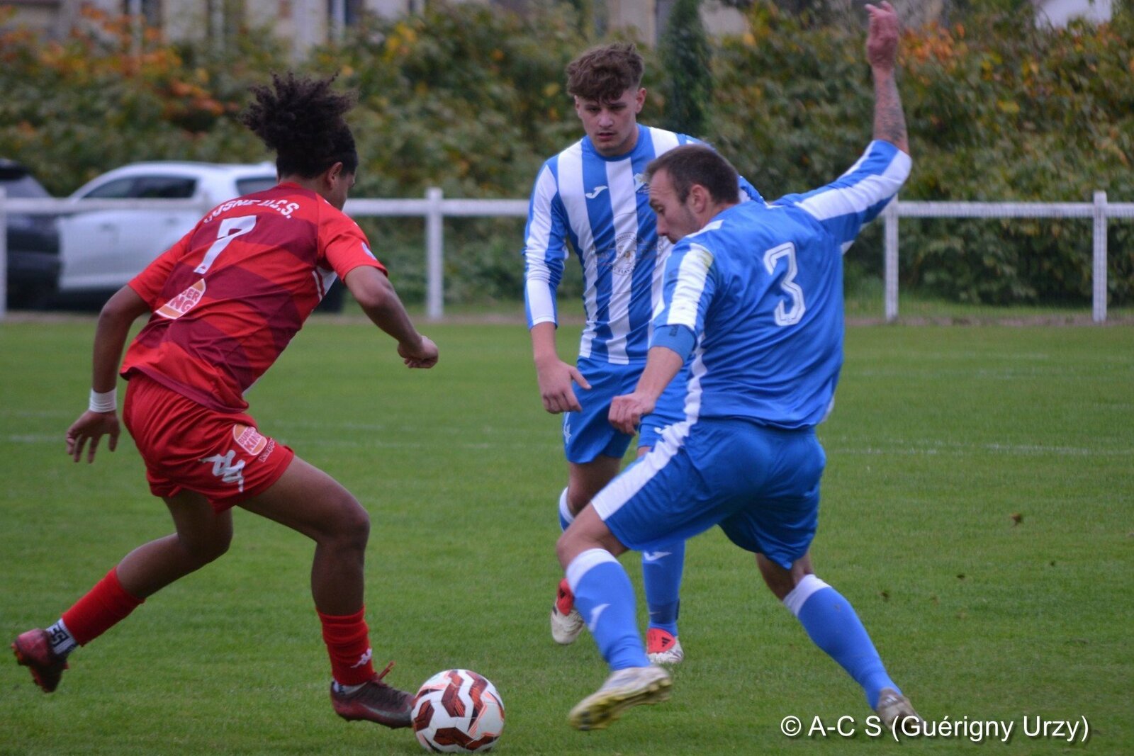 GUÉRIGNY (stade municipal) : Guérigny – Cosne B, 3-2 (2-2). Arbitre : M. Binacchi. Buts pour Guérigny, Roger (10è), Larivé (36è) et Brunerie (75è) ; pour Cosne B, Hurtault Noa (14è) et Lecoutère (42è). Avertissements ; à Guérigny, Kebdani (90è) ; à Cosne B, Gunet (55è) et Kamassu (71è). Exclusion temporaire à Guérigny, Larivé (41è). Guérigny : Saint Jost, Meunier, Lemetayer, Laroche Aurélien, Larivé (Cap), Simoes, Krack, Gaillard, Dutilleux, Laroche Romain, Roger. Entrés en jeu : Jeault, Brunerie, Kebdani. Cosne B : Duval, Czajkowski Liam, Gunet, Kamassu, Lecoutère (cap), Desmergée, Hirt, Lebel, Hurtault Noa, Lebas, Mashaka. Entrés en jeu : Ongadia, Adoul Pier, Martini. |