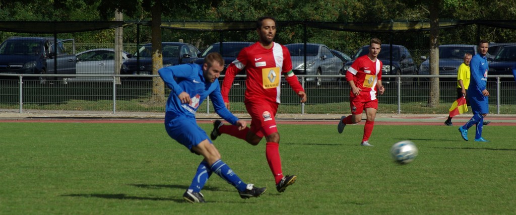 >>> photo >>> Pour Sylvain Guillaumot (en rouge au centre), auteur de deux buts dimanche face aux joviniens (en bleu), il ne faudra pas croire qu'on est déjà à niveau !!! Le plus dur est à venir >>>