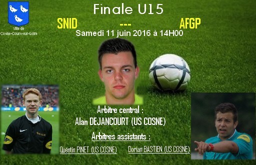 14H00 : Finale U15SNID - AFGP(Sud nivernais Imphy Decize) - (Fourchambault-Garchizy-Pougues) Arbitré par un trio d'arbitres cosnois : Alan Dejancourt, Dorian Bastien et Quentin Pinet. --- 16H30 : Finale U18