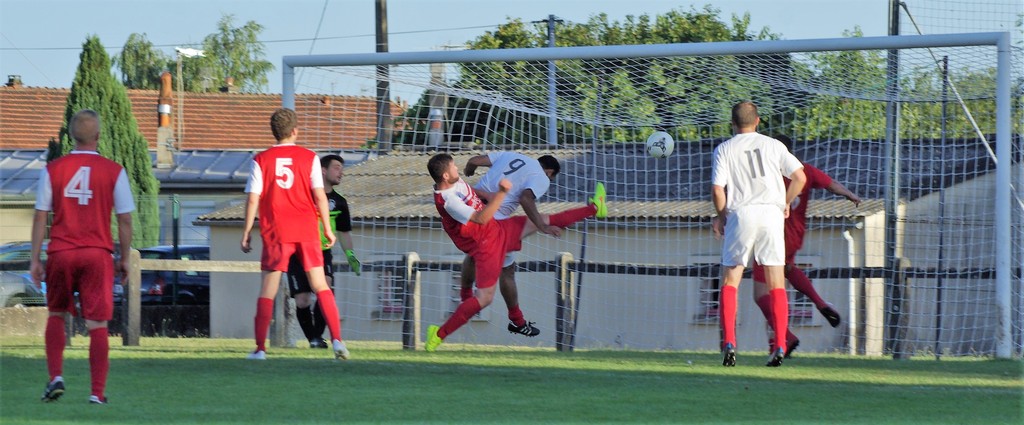 La qualité du jeu va baisser en seconde période avec des acteurs gênés par une forte chaleur, et des difficultés à poser le jeu au sol... De ces quarante-cinq minutes, on notera l'avantage pris par les locaux sur corner par Thépenier, bien oublié par la défense cosnoise : 3-2 (60è), mais une belle égalisation de la tête de Sylvain Guillaumot (photo) en toute fin de rencontre en conclusion d'un coup-franc bien frappé par Yann Touzeau pour Bastien Devin, au second poteau pour remise parfaite au buteur cosnois (3-3, 86è)...