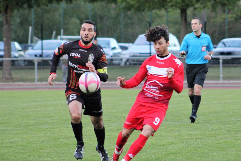 >>> photo >>> Le jeune Mattéo Berthé n'a pas été épargné mais a, de nouveau, livré un match plein (ici suivi par Tarik El Kobbi) >>>