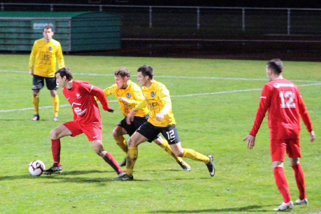 >>> photo >>> Saint Benin, en jaune, a couru après l'égalisation jusqu'au bout... sans succès, les Reby (balle au pied) et autre Henriques (de dos) veillant tant bien que mal "au grain" >>>