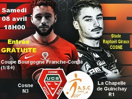 Si l'essentiel de ce week-end pascal sera consacré au 43ème tournoi de COSNE UCS FOOTBALL allant de ce samedi à dimanche avec les catégories U6/U7 (samedi) à U14/U15 (dimanche), une parenthèse officielle se glisse dans un programme au cordeau, à savoir les 1/8ème de Finale de la Coupe BOURGOGNE FRANCHE-COMTÉ opposant COSNE (N3) à L CHAPELLE DE GUINCHAY (R1).