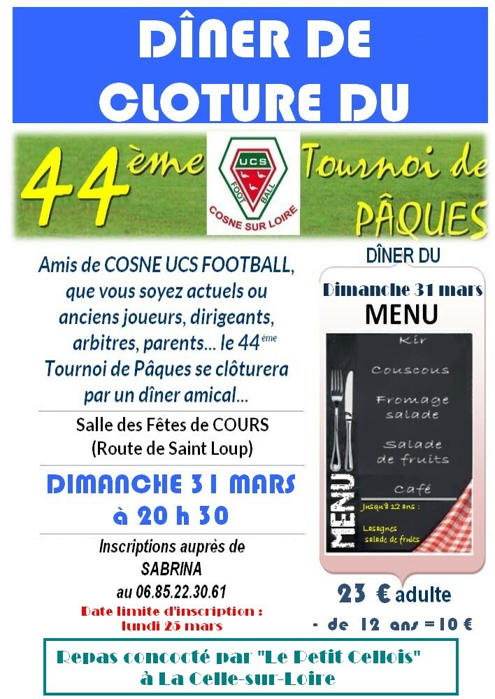 En cloture du 44ème tournoi de Pâques de l'UCS FOOTBALL, le Club des Partenaires et Supporters de l'UCS FOOTBALL propose un dîner à la Salle des Fêtes de Cours